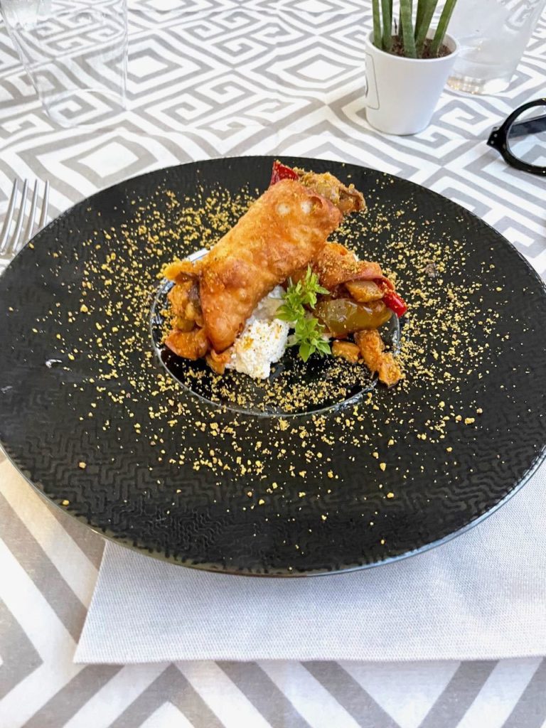 La route qui mène à la locanda, le paysage qu’elle offre, est sublime. La locanda elle-même n’a rien d’extraordinaire même si, en arrivant, on se doute que cela va être bien. Une chose que je vais appendre du chef, c’est que l’île, par tradition, est plutôt tournée vers l’agriculture que la pêche. La locanda n’est qu’à 4 km de la plage, mais elle présente une cuisine de la terre. On m’a conseillé en entrée une spécialité, un cannolo e caponata (cannolo à la farine de câpres, caponata e ricotta fresca di Vulcano). Cannolo version salée. Ricotta di Vulcano… Le chef, propriétaire, chauffeur (c’est lui qui était venu me chercher), m’a expliqué qu’il y avait des paysans à Vulcano, des bergers, ce que je n’imaginais pas. Très bon plat.